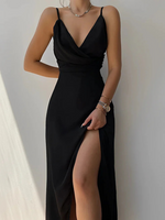 Let the night unfold in satin. The Alva Satin Dress flows with elegance thanks to its draped cowl neckline and silky finish. A thigh-high slit adds a bold twist to the soft silhouette, making it your perfect plus-one for rooftop evenings, sunset weddings, and everything in between. Dress it down for the daytime or let it shine with heels and gold accents after dark.