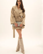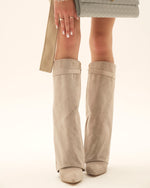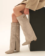 Diese Stiefel sind aus hochwertigem, handgefertigtem Wildleder gefertigt, das den gesamten Schuh – bis hin zum Schaft – umhüllt und einen maximal edlen Look verleiht. Der elegante Umschlag-Detail und die feminine Zierschnalle setzen stilvolle Akzente, während der versteckte Absatz die Silhouette dezent verlängert.
