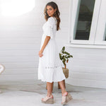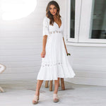 Featuring delicate lace accents, a flattering V-neckline, and a flowing silhouette, this dress is perfect for weddings, date nights, or any special occasion. The airy fabric and feminine design make it comfortable and chic, capturing the essence of effortless style. The Elena Lace Dress is a versatile addition to any wardrobe, offering a graceful look that never goes out of style. Embrace timeless beauty with this classic white dress designed for a romantic and elegant look.