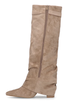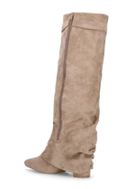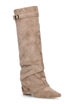 Diese Stiefel sind aus hochwertigem, handgefertigtem Wildleder gefertigt, das den gesamten Schuh – bis hin zum Schaft – umhüllt und einen maximal edlen Look verleiht. Der elegante Umschlag-Detail und die feminine Zierschnalle setzen stilvolle Akzente, während der versteckte Absatz die Silhouette dezent verlängert.