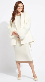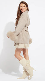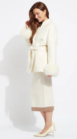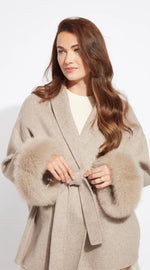 Crafted from a luxurious wool and cashmere blend, this wrap coat boasts an elegant silhouette with wide lapels and delicate side slits. Accentuated with premium fox fur on the collar and cuffs, it combines warmth, softness, and timeless glamour.