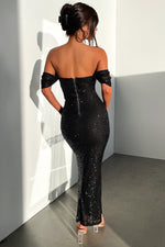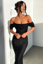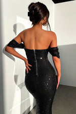 Fully lined and crafted with all-over black sequins, this dress features off-the-shoulder sleeves, boning at the bust, and a back zipper for a perfect fit. Pair it with black strappy heels and simple jewelry for a glamorous, head-turning look.
